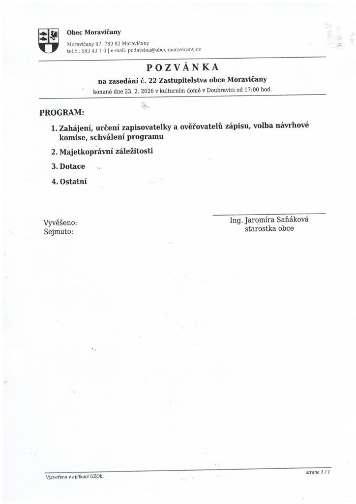 Pozvánka na zasedání č.22 Zastupitelstva obce v Doubravici